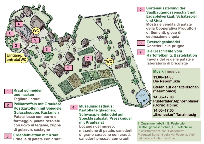 In una piacevole atmosfera, accompagnata da musica, visitatori e visitatrici potranno assistere alla preparazione di crauti di rapa e di cavolo e assaggiare pietanze a base di patate e cavoli, come gli "Erdäpflblattlan" (sfoglie di patate fritte) con crauti, i ravioli di patate, i canederli al grano saraceno con crauti, l'insalata di crauti e speck e i canederli alle prugne. Gli esperti della Cooperativa Produttori Sementi della Val Pusteria forniranno inoltre informazioni sulle diverse varietà di patate.