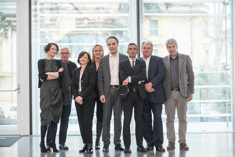 da sinistra: Letizia Ragaglia, Walter Agonese, Marion Piffer Damiani, Barbara Pizzinini, l'assessore Philipp Achammer, Antonio Lampis, Hans Peter Haselsteiner e Federico Giudiceandrea FOTO: Museion/Luca Meneghel