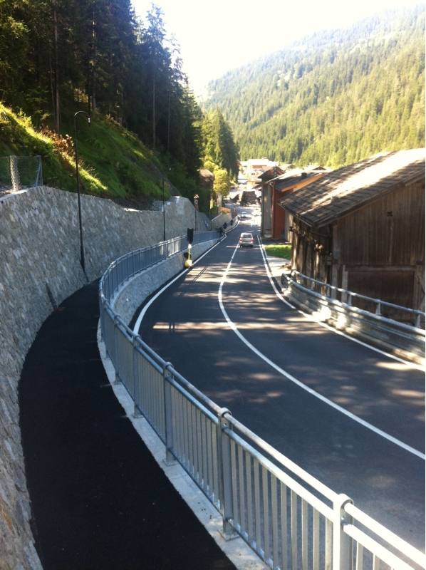 In particolare, per esplicita richiesta dell'Amministrazione comunale di La Valle, il marciapiede è stato predisposto sul lato monte della strada esistente e a un livello rialzato rispetto al nuovo livello stradale.