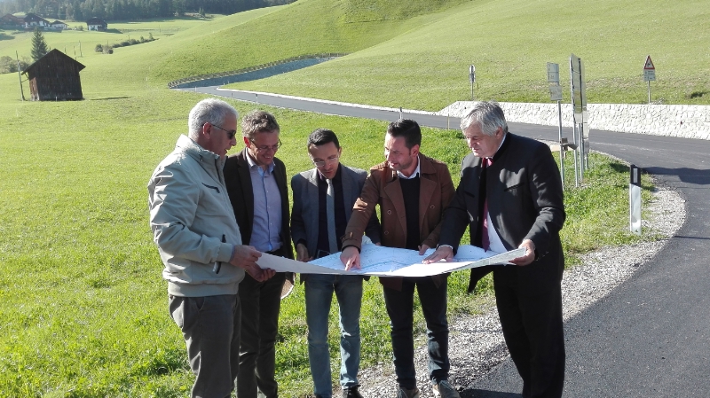 Dei lavori per la sistemazione della strada provinciale SP60 per la Valle gli assessori Tommasini e Mussner assieme ai tecnici hanno parlato con il sindaco della località, Angel Miribung.
