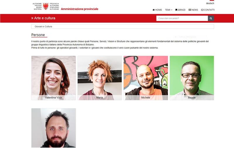 Operatori culturali, volontari, educatori, giovani start upper impegnati in attività in favore dei giovani si “video raccontano” online mostrando come le loro passioni ed esperienze di vita abbiano contribuito ad arricchire il ventaglio di proposte offerte ai giovani, nell’ottica di progetti sempre più variegati e coinvolgenti. Queste testimonianze sono pubblicate sulla pagina web del Servizio Giovani (http://www.provincia.bz.it/arte-cultura/giovani/persone.asp)