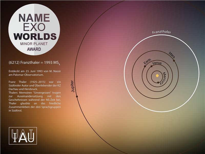 Il Planetarium ha scelto di intitolare l’asteroide a Franz Thaler, con la motivazione ufficiale: "Franz Thaler (1925-2015) è stato un autore originario del Sudtirolo (Italia) sopravvissuto ai campi di concentramento di Dachau e Hersbruck. Nelle sue memorie intitolate “Dimenticare mai” (“Unvergessen”) ha autonomamente iniziato un percorso di analisi delle proprie esperienze in relazione a quanto accadutogli durante l’occupazione nazista del Sudtirolo. Egli è sempre stato un alfiere della pacifica coesistenza dei tre gruppi linguistici del Sudtirolo."