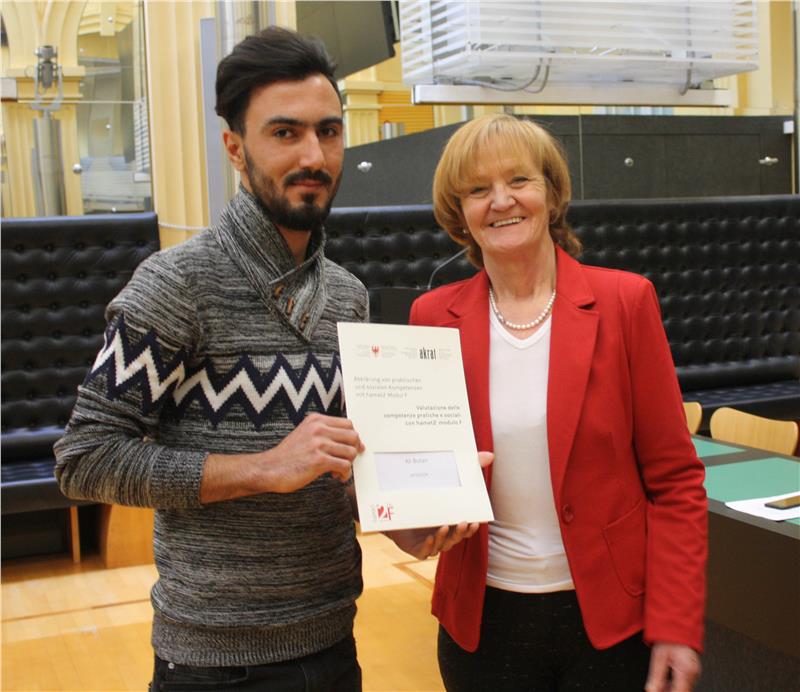 Sono 288 i richiedenti asilo che tra il 2016 e fine ottobre di quest’anno hanno conseguito un attestato nell’ambito del progetto pilota hamet2F che mira all’accertamento delle competenze professionali per il loro inserimento nel mondo del lavoro. Le persone richiedenti asilo ospitate nei Centri di accoglienza straordinaria (CAS) dati in gestione dalla Provincia ad organizzazioni come Caritas, Volontarius, River Equipe o Croce Rossa, alla fine del 2017 erano 1.593, di cui erano 313 occupati, mentre nel mese di ottobre 2018 il loro numero era di 1.299 unità, di cui sono 639, ovvero quasi la metà, occupati. Il progetto è stato avviato dall’Ufficio anziani e distretti sociali, diretto da Brigitte Waldner, in collaborazione con la cooperativa sociale AKRAT Recycling di Bolzano, presieduta da Peter Prossliner, mentre il responsabile del progetto è Herbert Öhrig. Nel corso della cerimonia conclusiva del progetto, tenutasi ieri (giovedì 22 novembre) a Palazzo Widmann, l’assessora Martha Stocker si è congratulata con i partecipanti per l’impegno e l’attenzione che hanno dedicato al test. "Grazie a questa certificazione delle vostre competenze – ha affermato l’assessora - potrete avere maggiori opportunità di entrare nel mondo del lavoro altoatesino. Un ruolo importante in questo contesto è rappresentato anche dalla conoscenza del tedesco e dell’italiano e vi invito quindi ad impegnarvi anche nello studio delle due lingue locali".