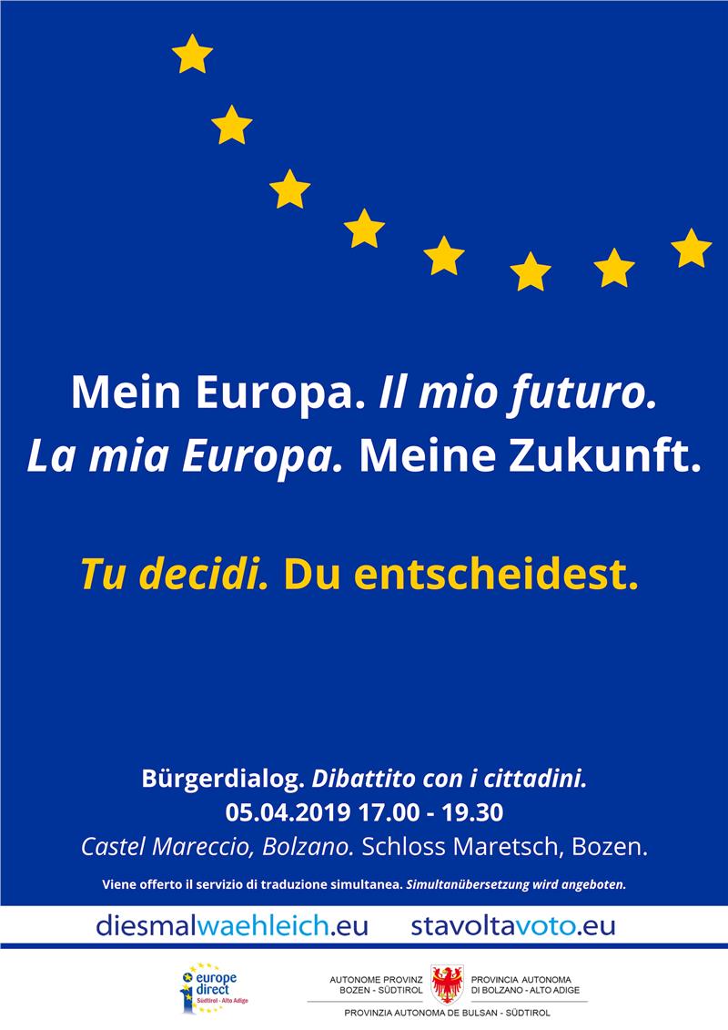 In vista delle prossime elezioni europee, Europe Direct, centro d'informazione ufficiale della UE in Alto Adige, operante all’interno della Ripartizione Europa, invita tutti i cittadini interessati a Castel Mareccio per avviare un confronto politico sul futuro dell’Unione Europea e per scambiare opinioni con esperti e rappresentanti politici. L’evento intitolato "La mia Europa. Il mio futuro" si svolgerà