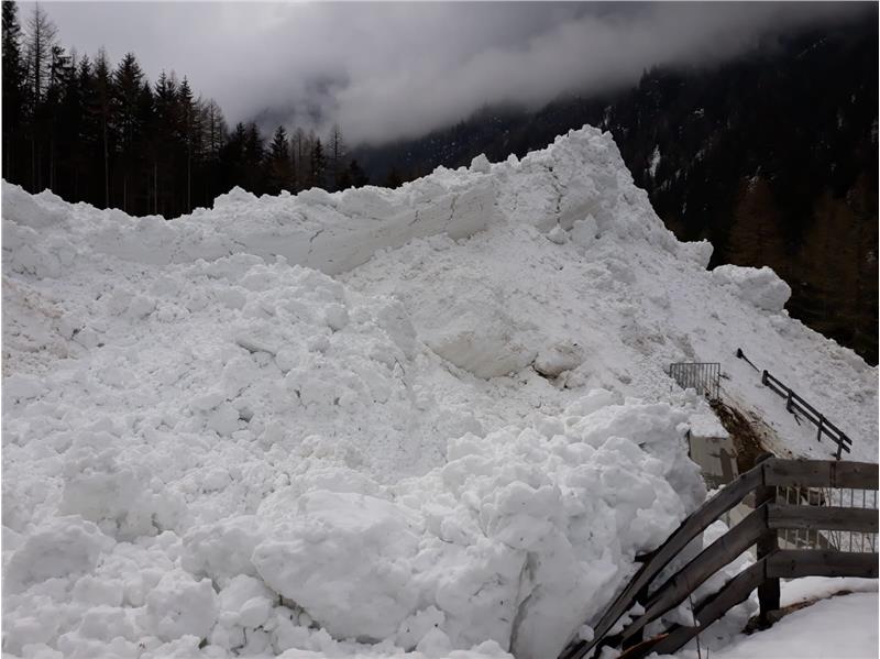 Una massa di circa 35.000 metri cubi di neve caduta il 10 aprile è stata bloccata dalla barriera paravalanghe sul fosso Breitlahn in val Martello di dentro.