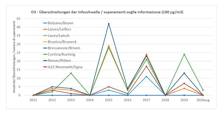 Sul sito dell’Agenzia provinciale per l’ambiente e la tutela del clima sono consultabili i dati giornalieri e mensili delle concentrazioni di ozono, rilevate da 13 stazioni di misura. L’ozono (O3) è un gas che in natura si trova negli strati alti dell’atmosfera in concentrazioni rilevanti, dove protegge dalla radiazione ultravioletta, e negli strati bassi è presente in concentrazioni che dipendono dalle reazioni fotochimiche che coinvolgono inquinanti emessi sia dall’attività dell’uomo che da processi naturali. La presenza di elevati livelli di ozono danneggia la salute umana, quella degli animali e delle piante.