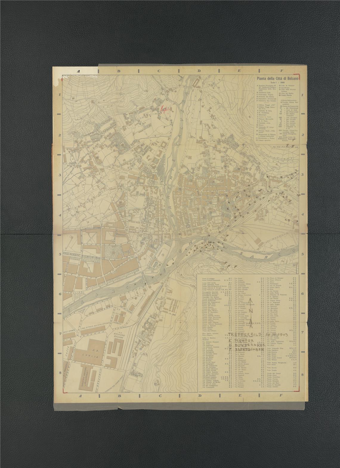 Tra il 2 settembre 1943 e il 28 febbraio 1945 la città di Bolzano è stata oggetto di 13 bombardamenti durante la Seconda Guerra mondiale. Gli ordigni che l’hanno colpita durante i bombardamenti compresi fra il 2 settembre 1943 e il 4 ottobre 1944 sono stati registrati puntualmente, mentre gli altri tre successivi, tra il 4 gennaio e il 28 febbraio 1945, non sono documentati. Le incursioni hanno interessato prevalentemente la zona della stazione ferroviaria. Questi dati sono riportati sulla mappatura degli ordigni bellici che il Curatorio per i Beni Tecnici Culturali ha scovato presso l’Abbazia di Muri Gries nel corso delle ricerche archivistiche condotte in merito all'areale della stazione ferroviaria di Bolzano. Il materiale cartografico originale, nove mappe in totale, indica la localizzazione puntuale con simboli precisi degli ordigni bellici - di bombe, ordigni inesplosi e bombe incendiarie - riportata in modo puntuale sulla mappa catastale di Bolzano. La preziosa documentazione, dopo la sua digitalizzazione, questa mattina (30 settembre) è stata trasferita alla pubblica amministrazione, Provincia e Comune di Bolzano, nell'ambito di un evento ufficiale. La consegna è avvenuta durante una conferenza stampa a cura di Wittfrida Mitterer, direttrice del Curatorio per i Beni Tecnici Culturali, alla presenza del rappresentante dei due enti e dell'autorità militare nella persona del colonnello Gaetano Celestrino.