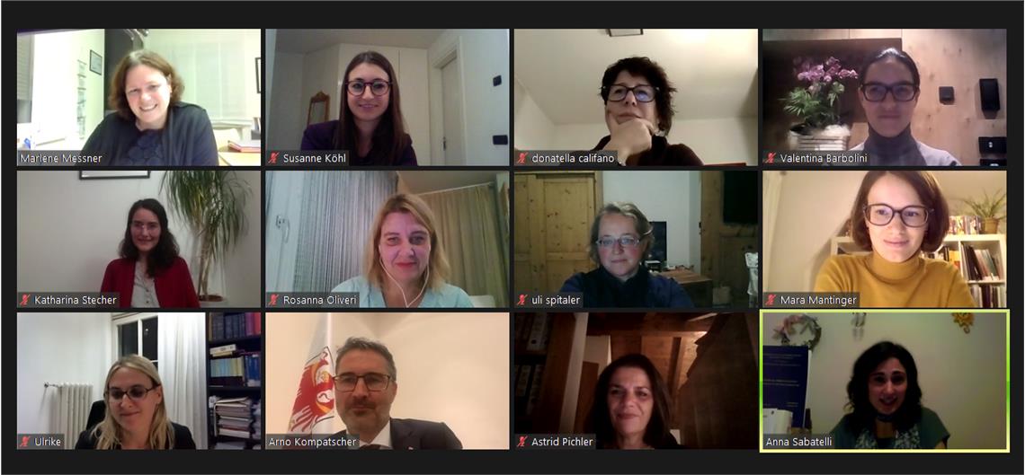 La cerimonia di premiazione delle tre vincitrici Mara Mantinger, Katharina Stecher e Anna Sabatelli è avvenuta nel pomeriggio di ieri sera (5 novembre) in modalità di videoconferenza con la partecipazione del presidente della Provincia e assessore alle pari opportunità Arno Kompatscher, della presidente e vicepresidente della Commissione per le pari opportunità, Ulrike Oberhammer e Donatella Califano, e della commissione di valutazione.