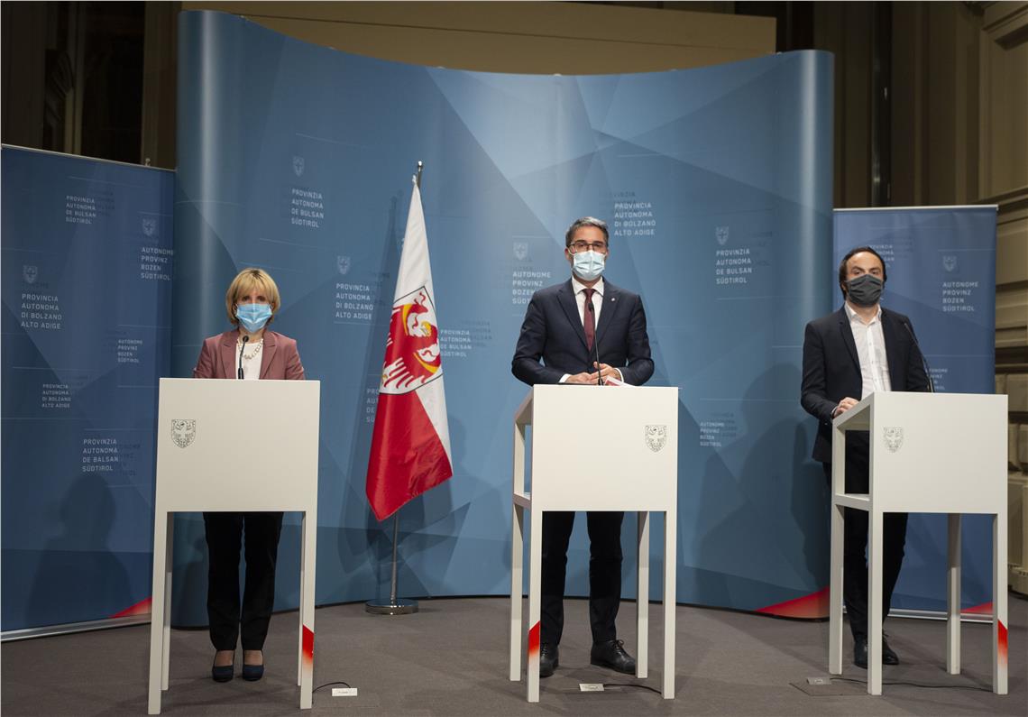 In primavera, alla fine del primo lockdown dovuto all’emergenza Coronavirus, la Giunta ha lanciato un pacchetto di misure denominato #AltoAdigesiriparte a sostegno dei cittadini, delle famiglie e delle aziende colpite dalla crisi. Oggi (4 dicembre) il presidente Arno Kompatscher, la vicepresidente Waltraud Deeg e l'assessore Philipp Achammer hanno fatto il punto sugli interventi attuati in primavera ed estate e su quelli che stanno per arrivare. In apertura di conferenza stampa il presidente ha anche riferito di aver ricevuto poco prima una telefonata dal ministro della salute Roberto Speranza che gli ha confermato il passaggio dell'Alto Adige dalla cosiddetta zona rossa alla zona arancione. Il Landeshauptmann ha quindi spiegato che al momento restano in vigore le misure previste dalla sua ultima ordinanza contingibile e urgente, la numero 73 (allegata a questo comunicato).