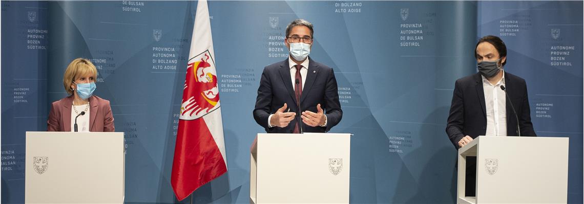 In primavera, alla fine del primo lockdown dovuto all’emergenza Coronavirus, la Giunta ha lanciato un pacchetto di misure denominato #AltoAdigesiriparte a sostegno dei cittadini, delle famiglie e delle aziende colpite dalla crisi. Oggi (4 dicembre) il presidente Arno Kompatscher, la vicepresidente Waltraud Deeg e l'assessore Philipp Achammer hanno fatto il punto sugli interventi attuati in primavera ed estate e su quelli che stanno per arrivare. In apertura di conferenza stampa il presidente ha anche riferito di aver ricevuto poco prima una telefonata dal ministro della salute Roberto Speranza che gli ha confermato il passaggio dell'Alto Adige dalla cosiddetta zona rossa alla zona arancione. Il Landeshauptmann ha quindi spiegato che al momento restano in vigore le misure previste dalla sua ultima ordinanza contingibile e urgente, la numero 73 (allegata a questo comunicato).