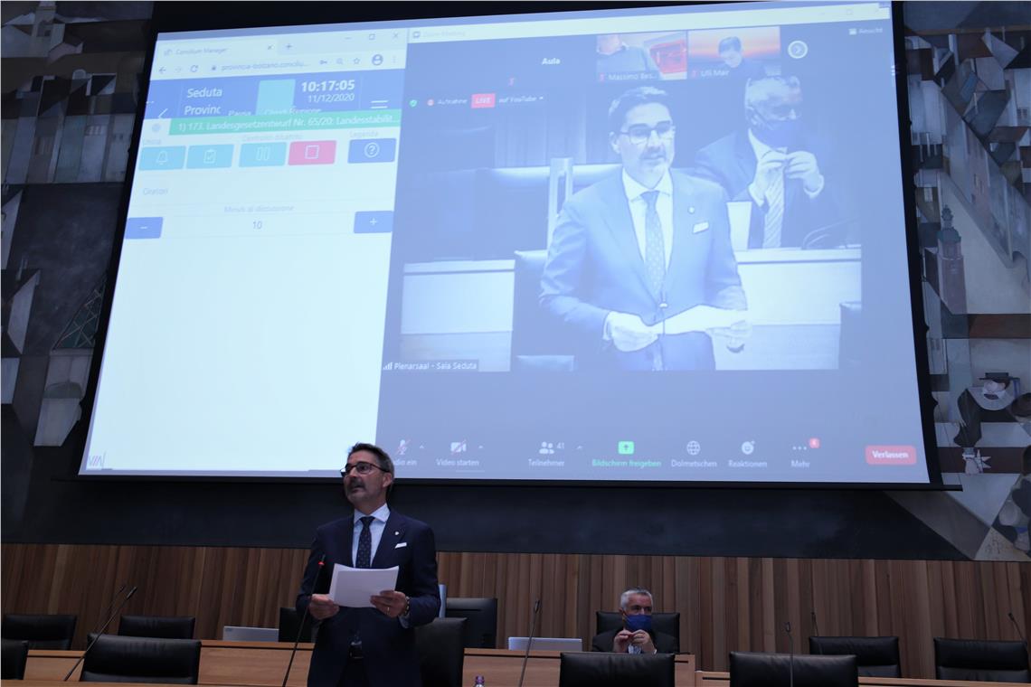 "La crisi del coronavirus e l'anno che sarà presto alle nostre spalle" sono i due temi che hanno aperto la relazione del presidente della Provincia Arno Kompatscher. "La pandemia di SARS-CoV-2 ha richiesto ai bilanci pubblici, alle istituzioni politiche, alla società democratica e a moltissime persone un impegno molto maggiore di quello che un anno fa avremmo solo osato immaginare" ha rimarcato il presidente della Provincia. "Molte persone nella nostra provincia, nell’Euroregione Tirolo-Alto Adige-Trentino, in Italia e in Europa hanno affrontato quest’anno un impegno eccezionale, che mai avrebbero immaginato di poter sostenere. Molti si sono spesi per la nostra comunità fino allo sfinimento" ha detto Kompatscher. Il presidente della Provincia ha chiesto al Consiglio provinciale di rispettare un minuto di silenzio alla memoria delle oltre 600 persone che hanno perso la vita a causa del coronavirus.