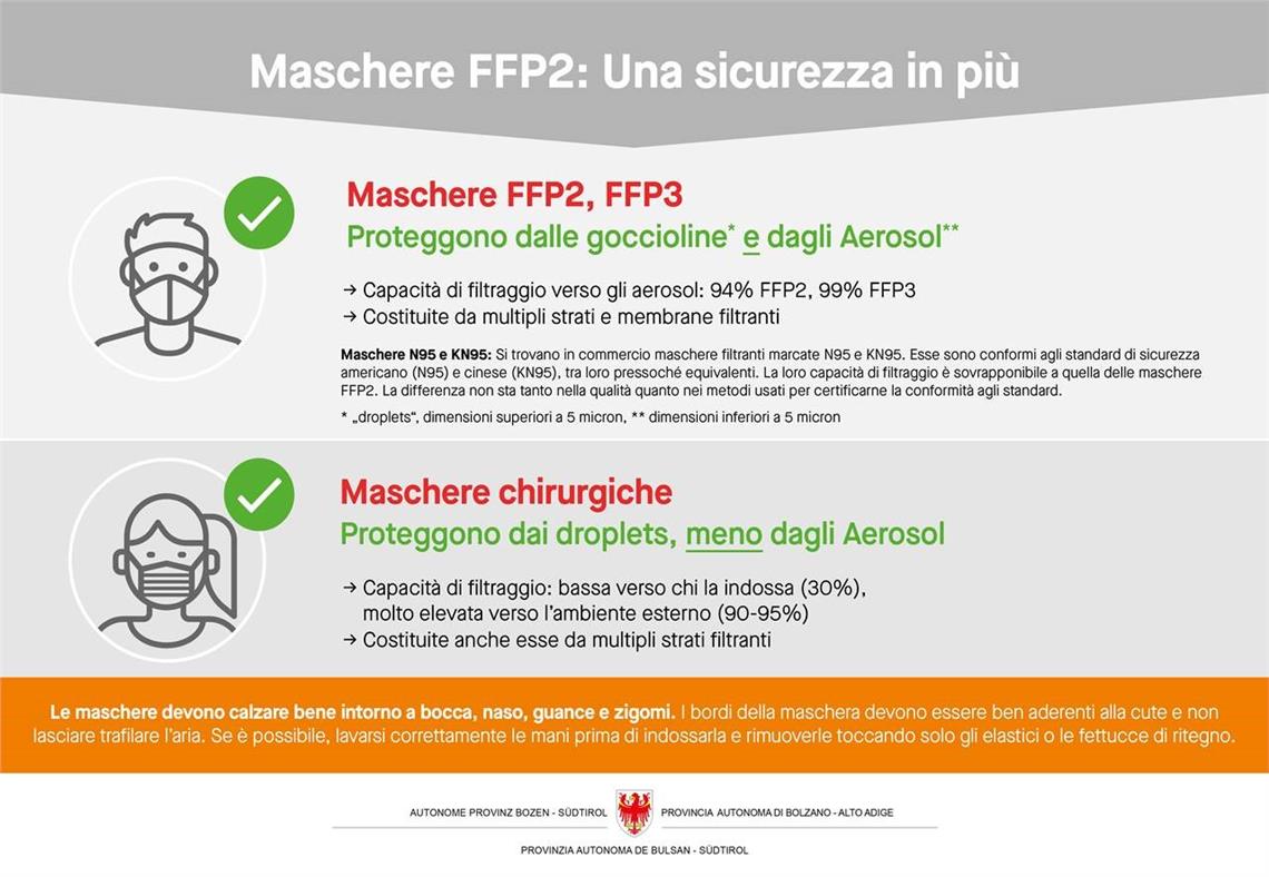 Nell’Ordinanza firmata ieri (28 gennaio) dal presidente Kompatscher si consiglia a tutta la popolazione di portare le mascherine FFP2 in caso di assembramenti.