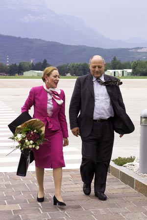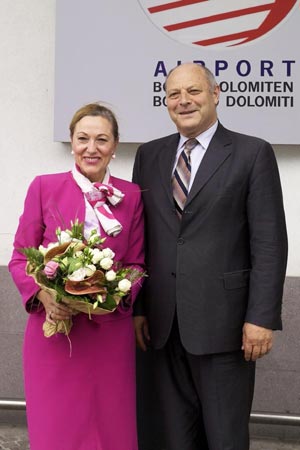 Il presidente Durnwalder accoglie all'aeroporto di Bolzano la ministro Ferrero Waldner (Foto USP/Josef Pernter)