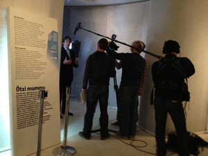 Interview mit Albert Zink. Dreharbeiten von Spiegel TV für die Sendung "Terra X" im Südtiroler Archäologiemuseum © Südtiroler Archäologiemuseum