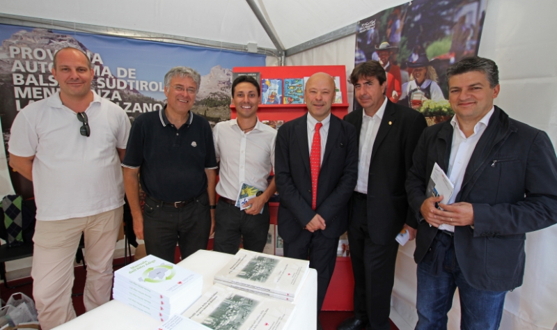 Abteilungsdirektor Prinoth am Informationsstand mit dem aostaner Schul- und Kulturassessor Laurent Viérin, Handelskammerpräsident Nicola Rosset, Regionalrats-Vizepräsident André Lanièce und Musikschuldirektor Luigi Bertschy