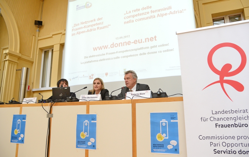 Vor geballter Südtiroler Frauenpower haben der Landesrat für Chancengleichheit, Roberto Bizzo, die Präsidentin des Landesbeirates für Chancengleichheit, Ulrike Oberhammer, und die Projektbeauftragte Astrid Pichler vom Frauenbüro des Landes das Interreg-IV-Projekt "Frauen entscheiden" vorgestellt. Im Mittelpunkt stand dabei eine Videkonferenz mit den Partnerländern Kärnten, Salzburg, Tirol, der Provinz Udine und der Region Friaul-Julisch Venetien, in deren Rahmen die ePlattform www.donne-eu.net frei geschaltet wurde. "Ich glaube fest an dieses Projekt", erklärte bei der Veranstaltung im Innenhof des Bozner Palais Widmann Landesrat Bizzo, "zum einen, weil es Frauen eine unmittelbare und leicht zu benützende Hilfestellung bietet, zum anderen, weil ich mich als Landesrat für Innovation auch für die Nutzung neuer Technologien stark mache."