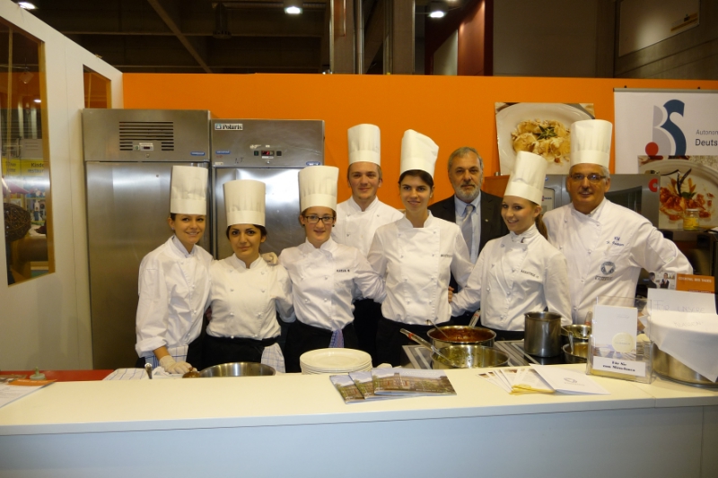 Angehende Köchinnen und Köche auf der Hotelmesse mit Direktor Josef Paler und Fachlehrer und Küchenmeister Heinrich Gasteiger