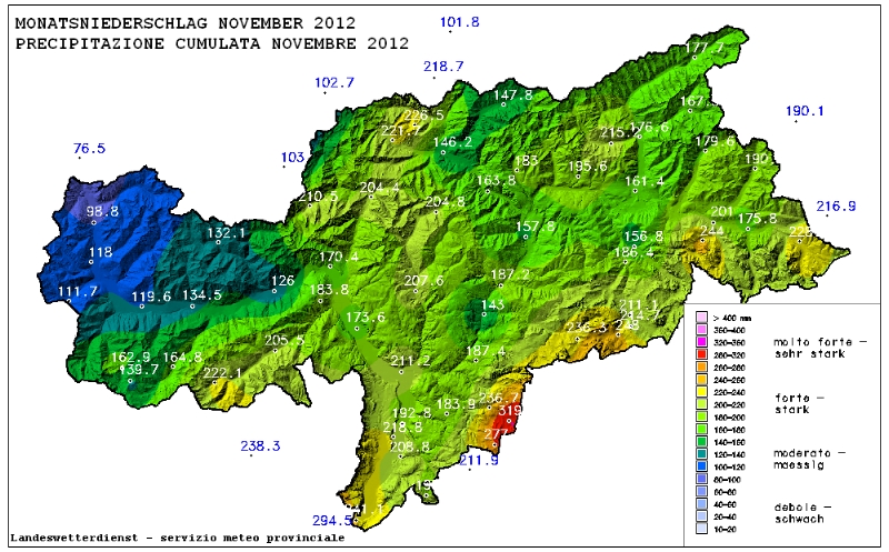 LPA - Der November 2012 geht in Südtirol als außergewöhnlich nasser Monat in die Wettergeschichte ein. "Im ganzen Land fiel zumindest das Doppelte der üblichen Niederschlagssumme, in manchen Regionen waren es sogar das Drei- bis Vierfache", sagt Landesmeteorloge Dieter Peterlin.