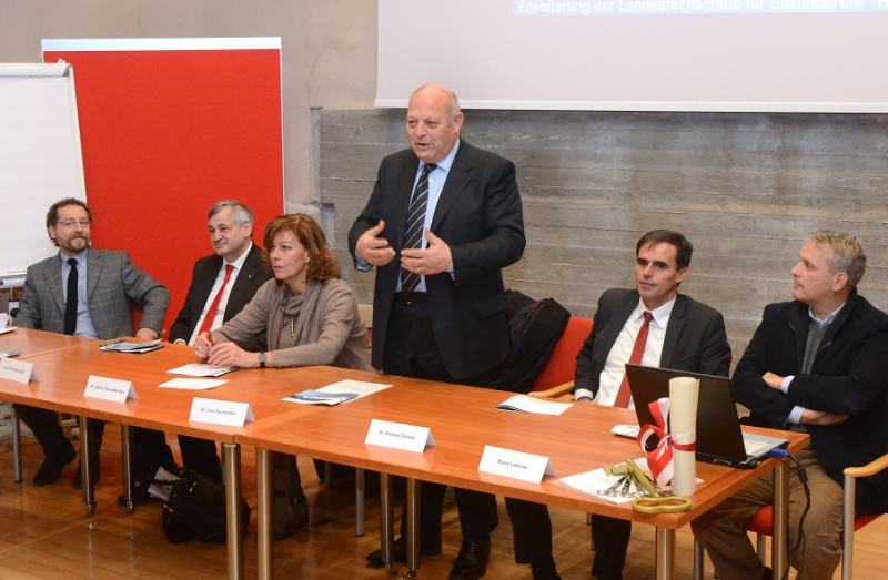Seiner Freude darüber, dass in diesem Bau "Altes mit Neuem sinnvoll verbunden" ist, gab Landeshauptmann Luis Durnwalder bei der Übergabefeier Ausdruck. Dieser Tag sei ein ganz besonderer, führte er aus, seien doch an einem Vormittag gleich zwei historische klösterliche Gemäuer in eine innovative Zukunft hineingeführt worden. Bautenlandesrat Florian Mussner betonte die Wichtigkeit, bestehende Bauten zu erweitern: "Hier wurde für die Zukunft gebaut, dieser Bau ist ein Pilotprojekt für unsere zukünftige Tätigkeit." Schullandesrätin Sabina Kasslatter Mur erinnerte an die Anfangszeit der Landesfachschule für Sozilaberufe 1984 mit zwei Klassen; im laufenden Schuljahr zählt die Ausbildungsstätte 600 Auszubildende: "Dies entspricht den gegenwärtigen gesellschaftlichen Erfordernissen, ist doch unsere Gesellschaft immer nötiger auf Fachkräfte im Sozialbereich angewiesen." Gebaut worden sei nach den Erfordernissen modernen Lehrens und Lernens, erklärte die Landesrätin, nach den Kriterien von Offenheit und Transparenz für ein Lernen in kleinen Gruppen. Die Schul- und Bildungslandesrätin bedankte sich ausdrücklich beim Bautenlandesrat dafür, dass er "immer ein offenes Ohr und offene Hände für die Belange der Bildung und der Schule" habe. Soziallandesrat Richard Theiner erinnerte daran, dass die Herausforderungen immer größer würden, man brauche immer qualifizierteres Personal: "Berufe im Sozialbereich haben Zukunft - in zehn Jahren sind die Arbeitsplätze von 3.800 auf über 6.000 angewachsen."