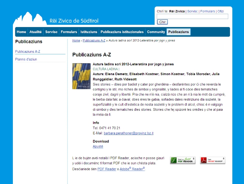 LPA - Im ladinischen Bürgernetz kann jetzt eine neue Rubrik genutzt werden: Passend zum Welttag des Buches am morgigen Dienstag, dem 23. April, wurden "Publicaziuns A - Z" online gestellt. "Das Interesse an ladinischen Texten ist groß", unterstreicht Landesrat Mussner.