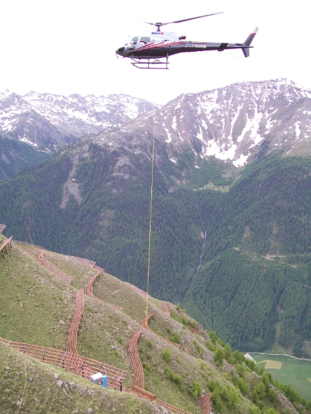 LPA - Auf 2330 Metern Meereshöhe sind die Mitarbeiter des Landesamts für Wildbach- und Lawinenverbauung West seit einigen Wochen im Einsatz. In sehr steilem Gelände montieren sie mit Hilfe eines Hubschraubers 174 Laufmeter Schneebrücken aus Stahl zum Schutz vor der Rainhoflawine. „Die Lawine bricht auf dieser Höhe ab und bedroht die Ortschaft Unser Frau im Schnalstal, weil sie dort ihren Auslauf hat“, erklärt der Direktor der Landesabteilung Wasserschutzbauten Rudolf Pollinger.
