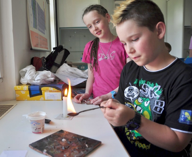 Was sie während der Woche bei der Sommerakademie "Sapientia ludens" ausprobiert haben - im Bild Flammenversuche - zeigen die Kinder der Grundschule zum Abschluss an diesem Freitag.