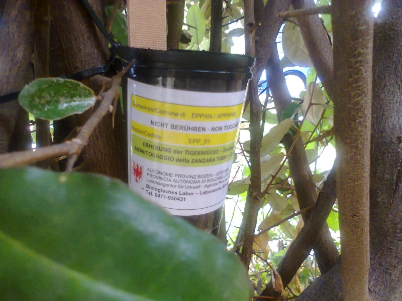 Aufgrund der wiederholten Mückenplage, insbesondere in Bozen, hat das Departement für Gesundheitsvorsorge gemeinsam mit dem Biologischen Labor der Umweltagentur und der Gemeinde Bozen die Arbeitsgruppe "Tigermücke" eingerichtet: Sie beschäftigt sich mit verschiedenen Aspekten rund um das Problem, von Vorsorge, Larvenbekämpfung bis hin zur wissenschaftlichen Mückenerhebung, und orientiert sich an Erfahrungen in anderen norditalienischen Regionen. Die Sanität hat die Dringlichkeit des Problems Tigermücke erkannt und unterstützt finanziell die wissenschaftliche Untersuchung. Im Juli konnten zwei eigens für dieses Projekt beauftragte Biologen im Biologischen Labor mit ihrer Arbeit beginnen; sie haben in Unterland, Etsch- und Eisacktal Eiablagefallen an beschatteten Standorten im öffentlichen Grün ausgebracht. Die schwarzen, beschrifteten Kunststoffbehälter sind mit Wasser gefüllt und enthalten ein längliches Holzbrettchen, das durch seine raue Oberfläche von den Tigermückenweibchen als Eiablage-Unterlage bevorzugt wird.
