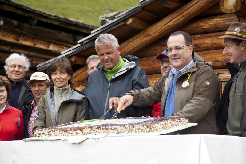 Die von der größten Naturparkgemeinde Sand in Taufers gestiftete Torte reichte für die rund 150 Teilnehmenden am Fest. Die Naturparkbetreuer boten ein ansprechendes Rahmenprogramm mit Naturspielen, Barfuß-Parcour und Ratespielen.
