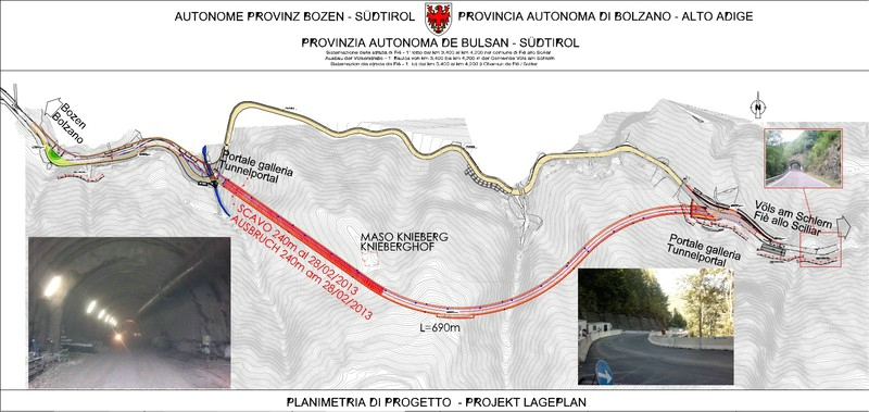 Über die Bauarbeiten, die in den Händen der Bauunternehmen Oberosler Cav. Pietro, Keller Fondazioni und Bitumisarco liegt, berichtete heute der Direktor der Landesabteilung Tiefbau, Valentino Pagani und die Projektverantwortliche Ingenieurin Gabriella Zanetti. Demnach gilt es nun noch die Innenschale des Tunnels auszuführen, die technischen Anlagen einzubauen und verschiedene Arbeiten im Freien durchzuführen sowie den bestehenden Felstunnels abzubrechen. Im Juni 2014  soll der insgesamt zwölf Millionen Euro teure Tunnel dann fertiggestellt sein.