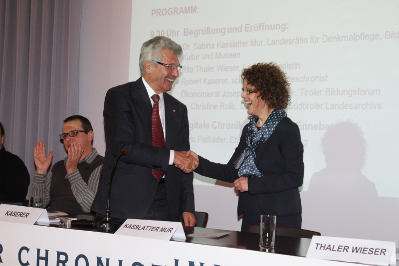 "Ihre Tätigkeit", wandte sich die Kulturlandesrätin an die zahlreichen Chronistinnen und Chronisten, "ist eine wichtige und wertvolle Kulturarbeit, die auf die Zukunft ausgerichtet ist". Ihre Arbeit, hob sie hervor, könne von der Landesverwaltung nicht bezahlt werden, wohl aber gestärkt, unterstützt und begleitet. Besonders dankte sie Landesarchivdirektorin Christine Roilo und ihrem Vorgänger Josef Nössing, Chronik-Referentin Margot Pizzini und dem scheidenden ersten Südtiroler Landeschronisten Robert Kaserer. Der Tscharser, der mit dem 10. Jänner 2010 dieses Amt übernommen hatte, erzählte von seinen Anfängen als Lehrer, dem sich wegen mangelnder Geschichtsbücher durch die selbstständige Erarbeitung von Unterlagen die Welt der Chronik erschloss. Seine Nachfolgerin Rita Thaler Wieser von der Geschichtswerkstatt Freienfeld nannte als fünf Schwerpunkte ihrer Arbeit die Imagestärkung und Öffentlichkeitsarbeit, die Verbesserung der Jahres- und Ereignischronik, die Aus- und Weiterbildung, die Notwendigkeit einer stärkeren Teambildung und den Ausbau der Netzwerkarbeit nach innen wie nach außen.