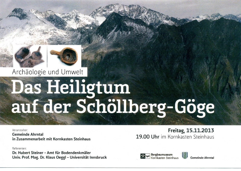 Am Freitag, 15. November berichten der Archäobotaniker Klaus Oeggl von der Universität Innsbruck und der Archäologe Hubert Steiner vom Amt für Bodendenkmäler in Bozen im Kornkasten Steinhaus über die neuesten Forschungsergebnisse zu diesen vorgeschichtlichen Moorfunden von der Gögealm am Weißenbach und das dort vermutete Heiligtum auf der Schöllberg-Göge. Der Vortragsabend beginnt um 19 Uhr und kann kostenlos besucht werden. Organisiert wird er von der Gemeinde Ahrntal in Zusammenarbeit mit dem Südtiroler Bergbaumuseum Kornkasten Steinhaus.