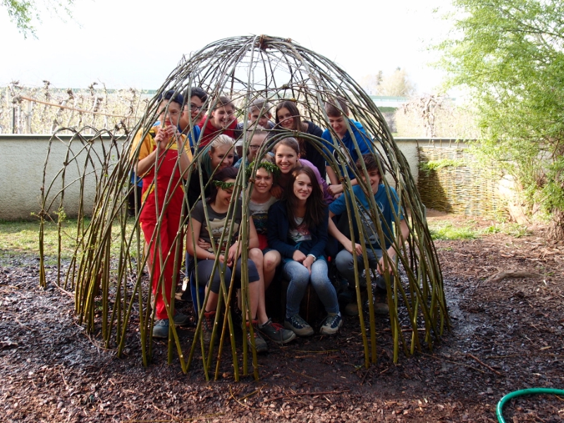 Die vierzehn Schülerinnen und Schüler bauten einen Tag lang den einjährigen Weidenruten zwei Spielhäuser, Tunnels und Weidenflechtzäune. Die Weidenflechtzäune wurden so errichtet, dass der Spielbereich abgegrenzt wurde und ein eigener Erlebnisraum entstehen konnte.