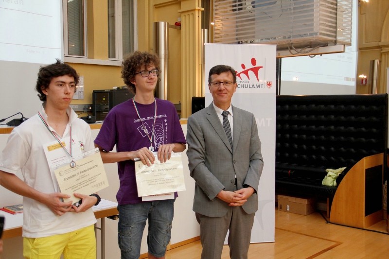 Die Medaillen erhielten beide Schüler heute in Bozen von Schulamtsleiter Peter Höllrigl umgehängt. Bei der Siegerehrung in Cesenatico konnten die beiden Schüler aus organisatorischen Gründen nicht teilnehmen. Die Freude des Schulamtsleiter war um so größer, die beiden Medaillengewinner persönlich in Bozen auszeichnen zu dürfen. Höllrigl lobte die herausragende Leistung der beiden Schüler, die auch auf nationaler Ebene ihr Können bewiesen haben.