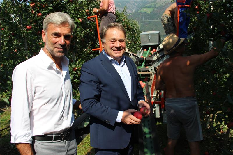 Minister Brunner, der sich auch den Beginn der Ernte in den Apfelanlagen des Landesrates ansah, betonte, dass die Südtiroler Landwirtschaft die Konkurrenz, beispielsweise aus Polen nicht zu fürchten brauche. „Schauen Sie mit Zuversicht in die Zukunft! Die Qualität der Südtiroler Äpfel wird in Bayern sehr geschätzt“, sagte Brunner. „Ihre Trümpfe sind Ihre Qualität und Professionalität sowie Ihre Kreativität und Innovationskraft. Bemerkenswert ist, dass Ihre Landwirte fast zu hundert Prozent in Erzeugerorganisationen zusammengeschlossen sind. Die Größe ist eben nicht alles, das haben wir während der Milchkrise gesehen, in der zehn Prozent der Milchviehbetriebe, die Arbeiter beschäftigten, aufgeben mussten. Familienbetriebe haben sich derweil in solchen Momenten als krisenresistenter erwiesen“, unterstrich Brunner.