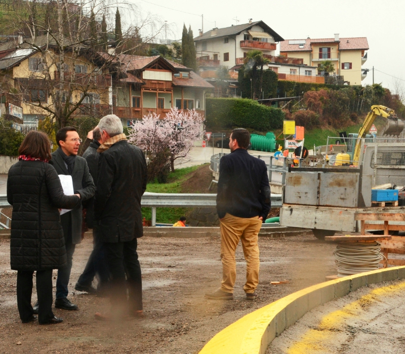 Ab dem 13. April beginnen dann die Arbeiten für den talseitigen Bereich des Kreisverkehrs mit der Errichtung der Fahrspur und der Randinseln sowie der Verlegung des Leerrohrs für das Glasfasernetz. Wie Valentino Pagani, der frühere Direktor der Landesabteilung für Mobilität, der in Vertretung von Landesrat Mussner am Lokalaugenschein teilnahm, erklärte, muss der Verkehr auf der Weinstraße daher bis zum 4. Mai auf den bergseitigen Teil des Kreisels verlegt werden, wobei eine abwechselnde Einbahnregelung zum Tragen kommt.