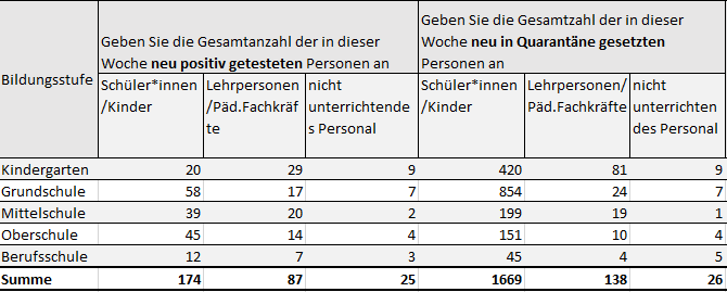Im Zusammenhang mit den neuen Infektionsfällen wurden 1833 Quarantänen neu verhängt, davon 510 an den Kindergärten, 885 an den Grundschulen, 219 an den Mittelschulen, 165 an den Oberschulen und 54 an den Berufsschulen.
