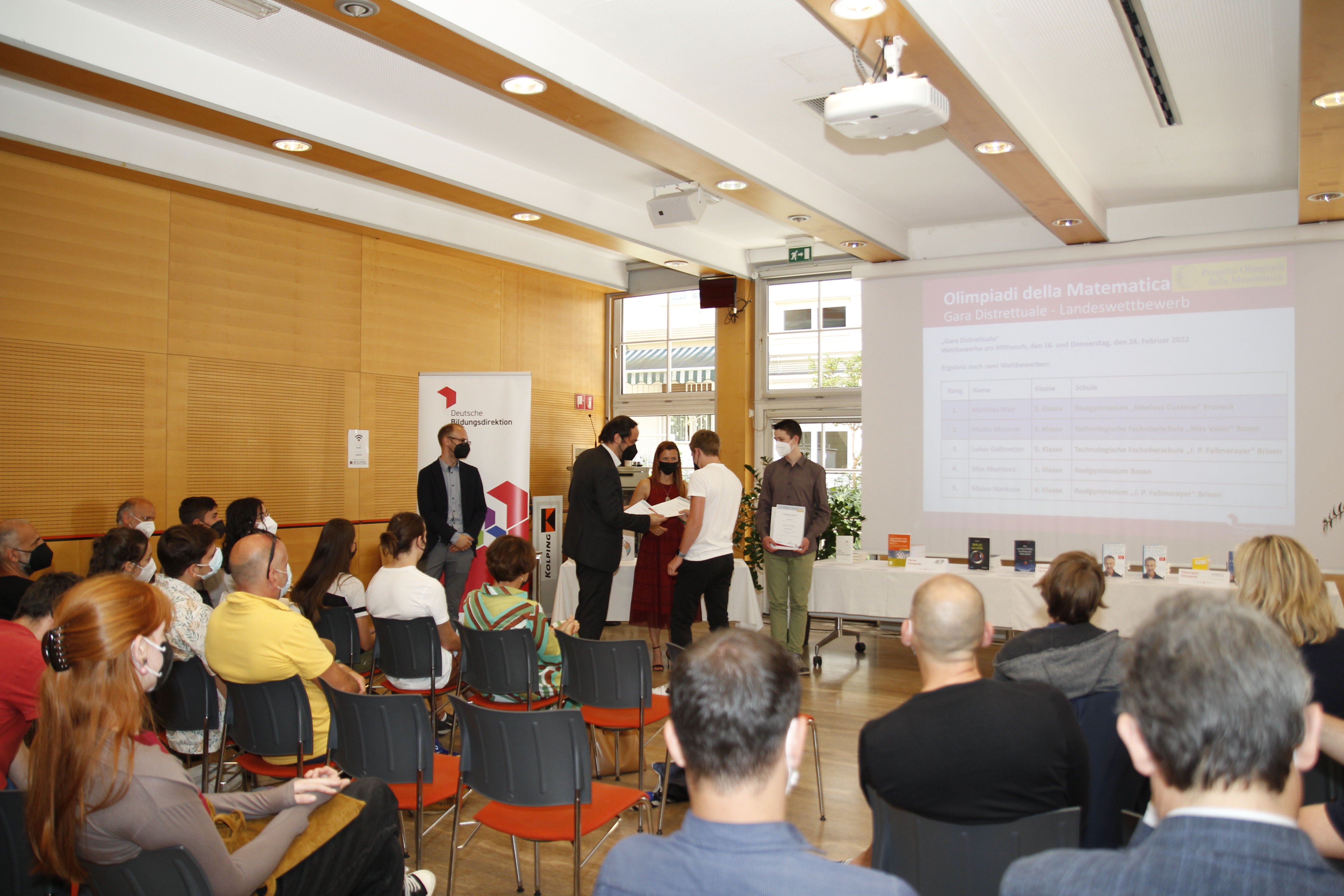 Die 45 Olympionikinnen und Olympioniken aus 14 deutschsprachigen Oberschulen, die bei den Landes-, Regional- oder gesamtstaatlichen Wettbewerben der Mathematik-, Informatik-, Physik-, Chemie- und Philosophieolympiade im Schuljahr 2021/22 die besten Platzierungen erreicht haben, sind heute (8. Juni) im Kolpinghaus in Bozen von Landesrat Philipp Achammer, Landesschuldirektorin Sigrun Falkensteiner und der Direktorin der Pädagogischen Abteilung der Deutschen Bildungsdirektion Gertrud Verdorfer mit Buchpreisen und Urkunden ausgezeichnet worden. Einige der Olympioniken machten mit Spitzenergebnissen auf sich aufmerksam (PowerPoint-Präsentation im Anhang).