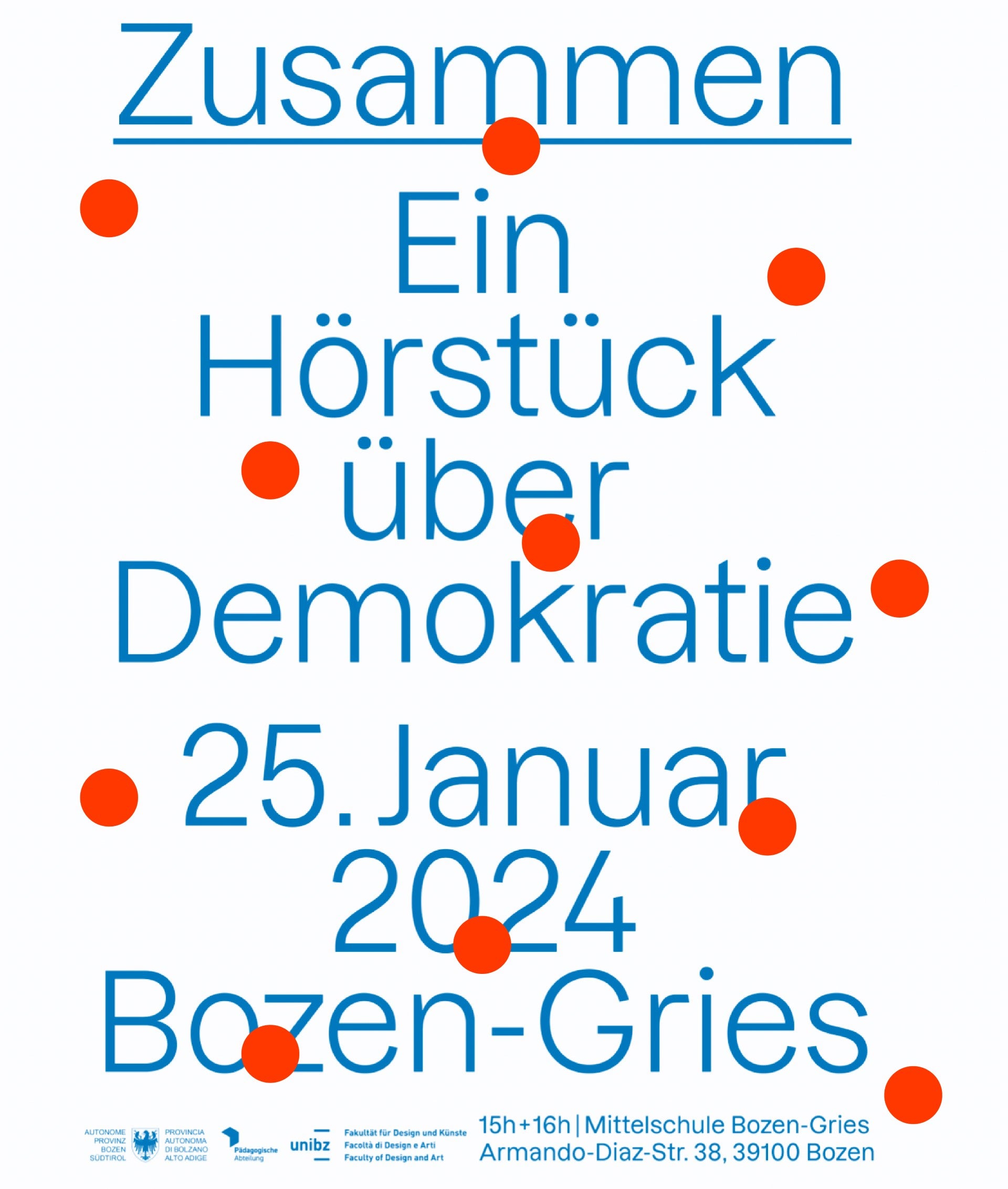 Etwa 100 Mittelschülerinnen und Mittelschüler aus Bozen-Gries, Eppan und Mölten haben mit elf Studierenden der Fakultät für Design und Künste in einem Projekt zur Demokratie, zu deren Bedeutung und deren Spielregeln gearbeitet. Entstanden ist ein Hörstück, das als Klangperformance umgesetzt wird. Das Projekt entspringt einer Kooperation zwischen der Pädagogischen Abteilung der Deutschen Bildungsdirektion und der Fakultät für Design und Künste der Freien Universität Bozen.