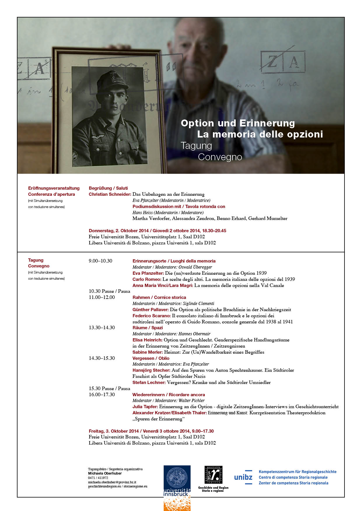 Die Tagung wendet sich an historisch Interessierte und Forschende, an Lehrpersonen und eventuell auch an Schulklassen. Das zentrale Thema der Tagung ist unsere Erinnerung an dieses einschneidende Ereignis in der Südtiroler Geschichte und der öffentliche und persönliche Umgang damit. Als Referenten konnten unter anderem Christian Schneider, Eva Pfanzelter, Carlo Romeo, Günter Pallaver und Stefan Lechner gewonnen werden.