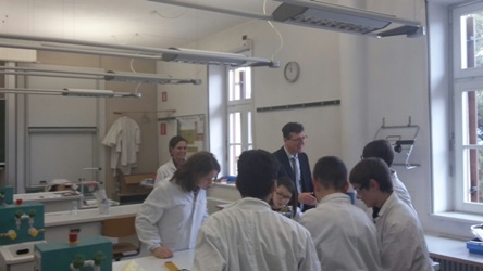 Vom praktischen Unterricht im Labor machten sich kürzlich Schulamtsleiter Peter Höllrigl und der Direktor des Bereichs Innovation und Beratung, Rudi Meraner, ein Bild. Sie schauten den Schülerinnen und Schülern der Klasse 3C der Mittelschule Tramin beim Arbeiten zu und stellten ihnen interessierte Fragen. Dass den Jugendlichen das Arbeiten im Labor sichtlich Spaß macht, davon waren die beiden Gäste nach ihrem Kurzbesuch überzeugt.