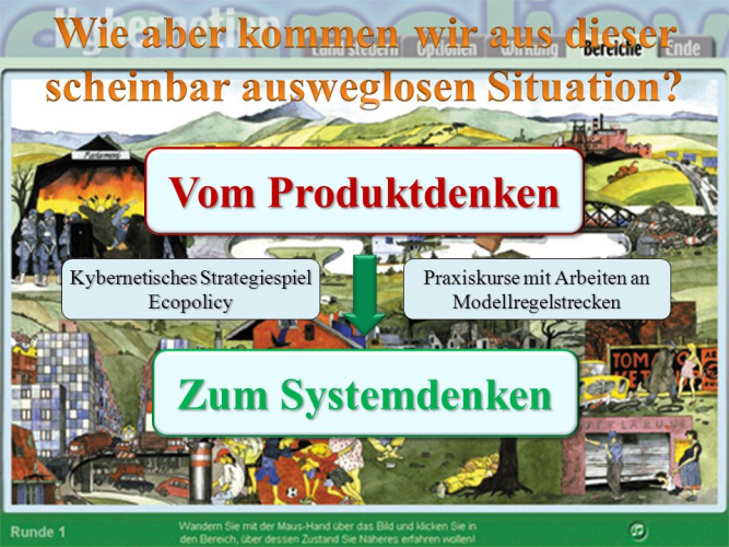 In der einführenden Fortbildung „Förderung vernetztes Denken“, die vom 24. bis 25 Oktober 2016 stattfindet (siehe Landesplan der Fortbildung Nummer 51.03), erhalten die Teilnehmenden Einblicke in die Grundlagen des vernetzten Denkens und in die Anwendung der Computersimulation zum vernetzten Denken ecopolicy®. Das PC-Simulation-Spiel ecopolicy® bietet den Jugendlichen die Möglichkeit, die Rolle des Staats- und Regierungsoberhauptes zu übernehmen und ein Land in den Paradieszustand zu führen. Dabei erkennen die Jugendlichen die Zusammenhänge zwischen den unterschiedlichen Fach- und Lebensbereichen. Sie lernen so vernetzt zu denken und in komplexen Systemen richtig und verantwortlich zu agieren.