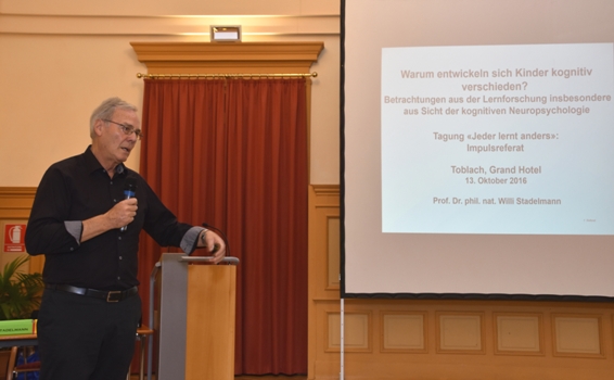 Der erste Referent des Vormittages, der Entwicklungspsychologe und Biochemiker Prof. Willi Stadelmann, ging in seinem Referat der Frage nach, warum sich Kinder kognitiv verschieden entwickeln und was diese Erkenntnisse für die Förderung der Kinder und Jugendlichen im Kindergarten und in der Schule bedeuten. Stadelmann machte deutlich, dass die Gene die Potenziale eines Menschen sind, welche die kognitiven Entwicklungsmöglichkeiten bestimmen. Ob diese Möglichkeiten allerdings ausgeschöpft werden, hängt von der Umwelt ab. Je förderlicher dieses Umfeld ist, desto besser kann das Kind seine Entwicklungsmöglichkeiten ausschöpfen. Es braucht aber vielfältige Reize und Eindrücke durch primäre Erfahrungen in der realen Welt. Die Konsequenz dieses Wissens: jeder Mensch ist ein Unikat, damit kann es auch keine homogenen Klassen geben. Es braucht also möglichst individuelle Zugänge der Förderung der Schülerinnen und Schüler.