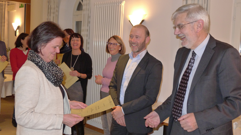 Die Übergabe der Zertifikate erfolgte durch Dr. Rudolf Meraner, Direktor des Bereichs Innovation und Beratung, und Dr. Volker Klotz, dem Geschäftsführenden Direktor der Abteilung Deutsche Kultur. Rudolf Meraner wies in seiner kurzen Ansprache auf die Bedeutung der Lesekompetenz hin und unterstrich die zentrale Rolle des Einsatzes der Lehrpersonen in der Schulbibliothek. Volker Klotz ging auf die Bedeutung von Schulbibliotheken für die Schulgemeinschaft ein. Gut ausgestattete Bibliotheken sind für die Leseförderung und für die Vermittlung der Informationskompetenz unabdingbar.