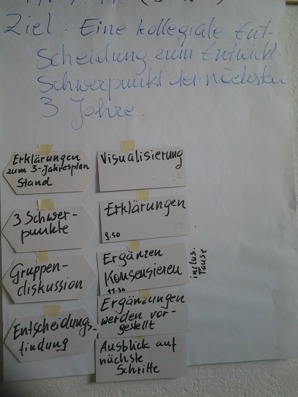Entwicklungsorientierte Schulführungskräfte sehen den Nutzen von kollegialen Entscheidungsprozessen und sahen entspannt auf das Produkt „Dreijahresplan“ – auch wenn das Ergebnis nicht immer ihren eigenen Wunschvorstellungen entsprach. Je etablierter Steuergruppen, Arbeitsgruppen „Schulprogramm“ oder Leitungsteams in der schulinternen Organisationsarchitektur sind, umso leichter und selbstverständlicher verlief der Erarbeitungsprozess.