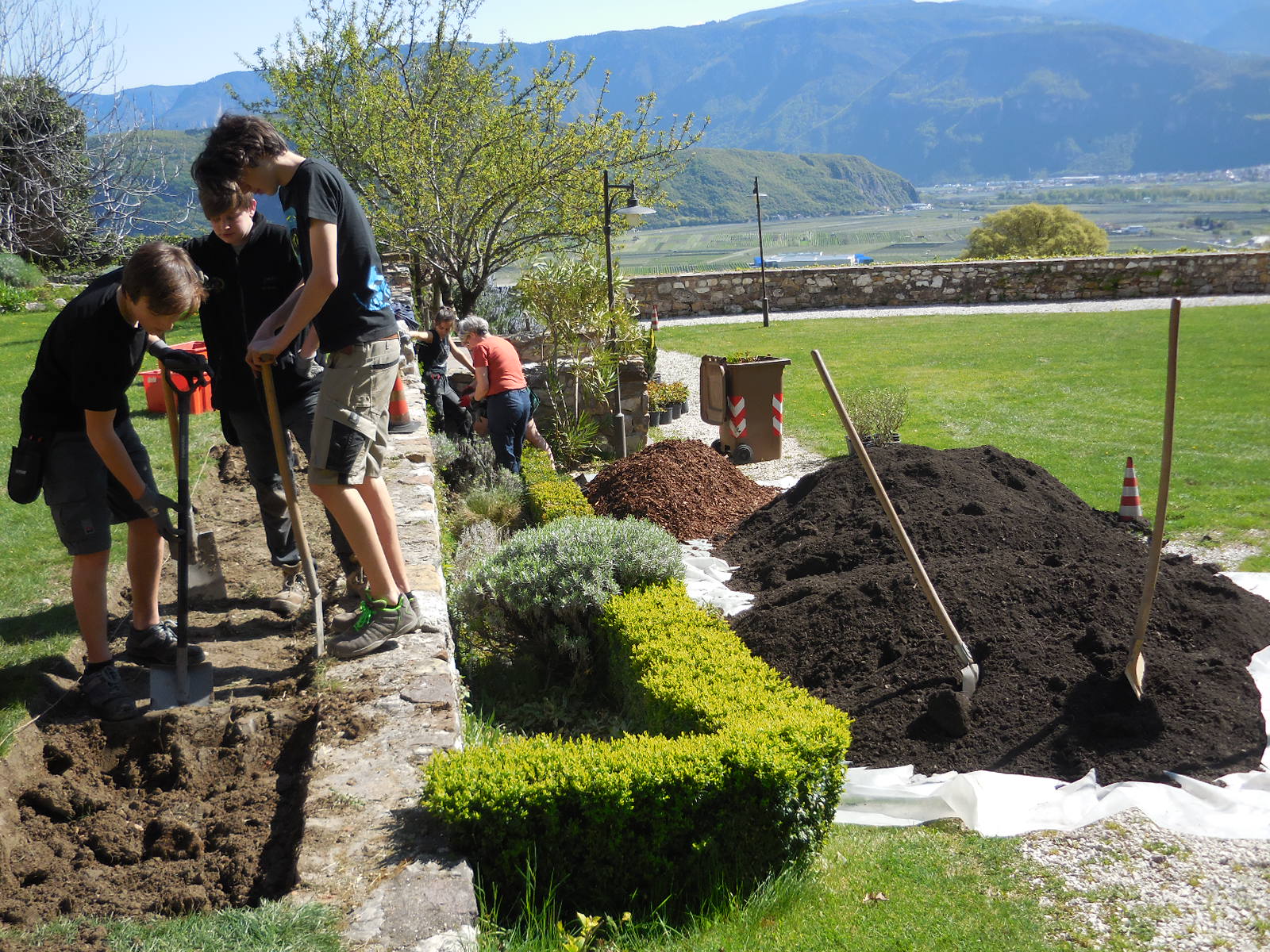 Mitte April arbeiteten insgesamt 27 Schülerinnen und Schüler im Rahmen einer bereits seit einigen Jahren bestehenden Kooperation zwischen der Laimburg und der Fortbildungsakademie den ganzen Tag über emsig im Garten von Schloss Rechtenthal.