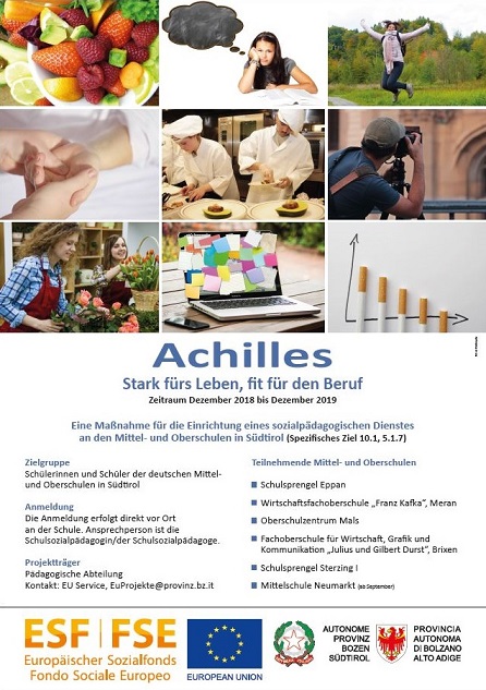 Das Projekt „Achilles 2020“ zielt darauf ab, einen sozialpädagogischen Dienst an Mittel- und Oberschulen in Südtirol bereitzustellen, der Maßnahmen im Bereich der Prävention für Klassen und Gruppen sowie individuelle Beratung und Unterstützung für Schülerinnen und Schüler anbietet.