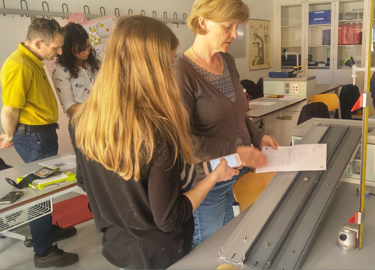 Dabei konnten die Kursteilnehmerinnen und Kursteilnehmer viele Versuche selbst ausprobieren, in die Schülerrolle schlüpfen und den Einsatz im Labor erproben. Zum Beispiel nahmen einige im Aufzug des Schulgebäudes beim Hinauf- und Hinunterfahren die Beschleunigungsdaten mit dem Smartphone auf. Diese übertrugen sie gleich anschließend auf den Computer und werteten sie aus. Andere wiederum untersuchten anhand der Beschleunigungssensoren die Dämpfung unterschiedlicher Schuhe.
