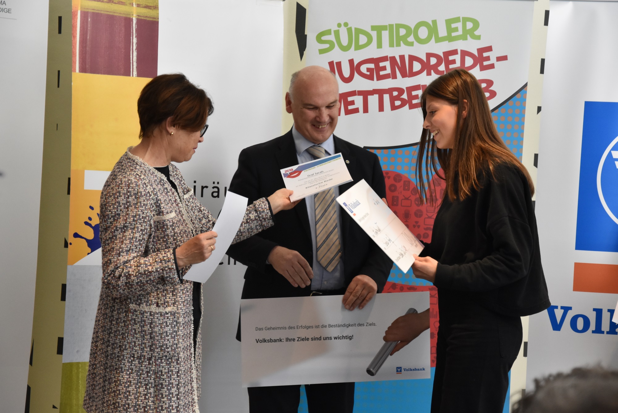 Der Bewerb wurde in bewährter Zusammenarbeit zwischen der Deutschen Bildungsdirektion, dem Amt für Jugendarbeit und dem Südtiroler Jugendring ausgetragen. Der Wettbewerb ist eine Live-Veranstaltung, daher lebendig und nicht alles ist vorhersehbar. „Neben dem Reden wird natürlich auch das Denken geschult, denn hinter den Worten steckt sehr viel prüfendes und vertiefendes Nachdenken”, sagte die Direktorin der Pädagogischen Abteilung, Gertrud Verdorfer. „Der Jugendredewettbewerb ist gelebte politische Bildung. Er zeigt, wie gesellschaftskritisch unsere Jugendlichen sind und wie sie gesellschaftliche Phänomene einordnen”, hob der Direktor des Amts für Jugendarbeit, Klaus Nothdurfter, hervor. Michael Kaun vom Südtiroler Jugendring ist überzeugt, dass sich viele Berufsredner von diesen Schülerinnen und Schülern eine Scheibe abschneiden könnten. Sein Appell an die Jugendlichen: „Hört nie auf, eure Meinung kundzutun“. Den Vize-Generaldirektor der Volksbank, Stefan Schmidhammer, hat die Rede über das Glück und jene über das bargeldlose Bezahlen beeindruckt. Er empfindet es als ein besonderes Glück, diese mutigen und jungen Redetalente als Gäste zu haben.