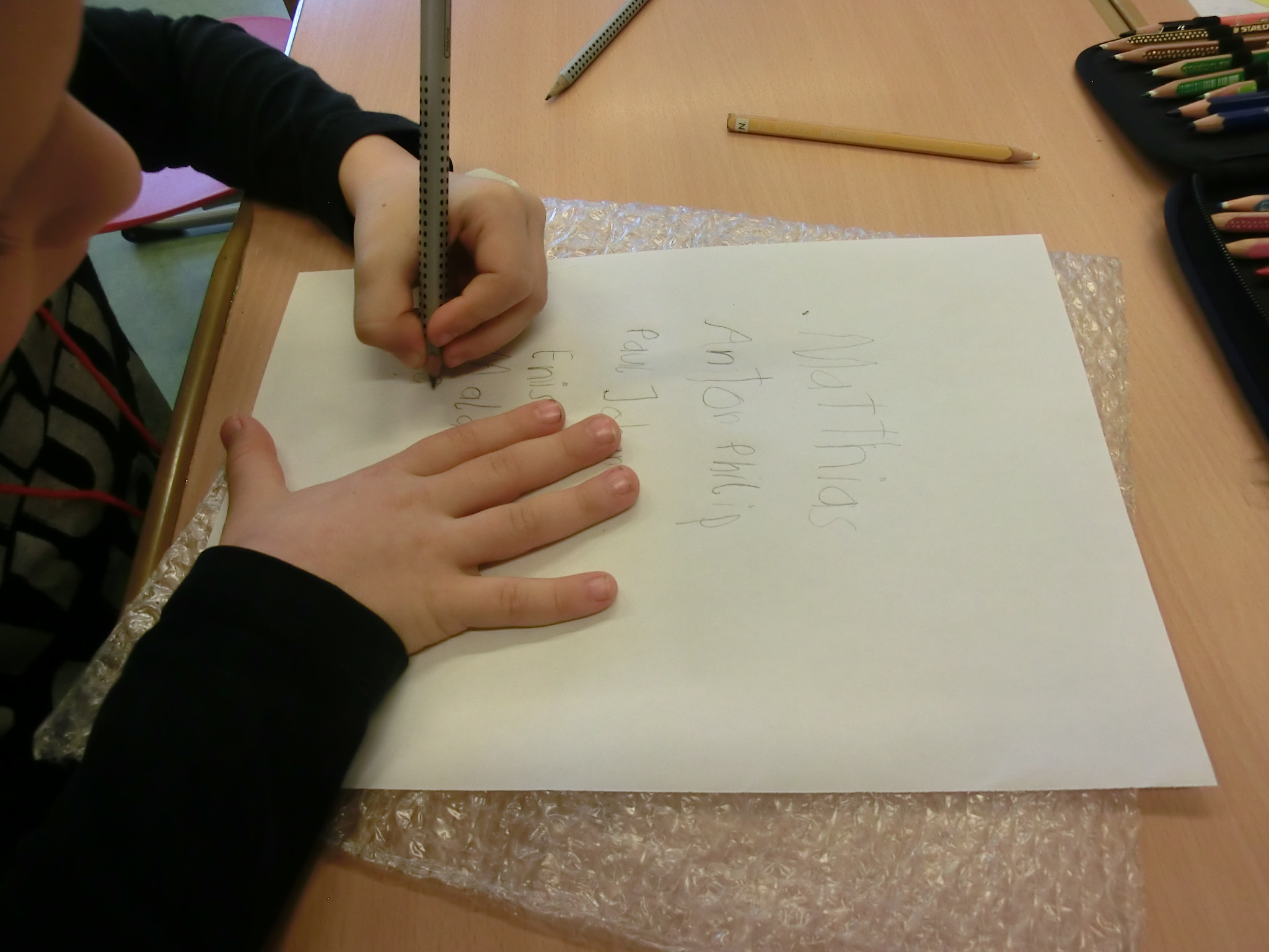 In der Grundschule Afing/Jenesien haben die Schülerinnen und Schüler verschiedene Schreibmaterialien ausprobiert und mit ihren Schreibprodukten eine große Wand geschmückt.