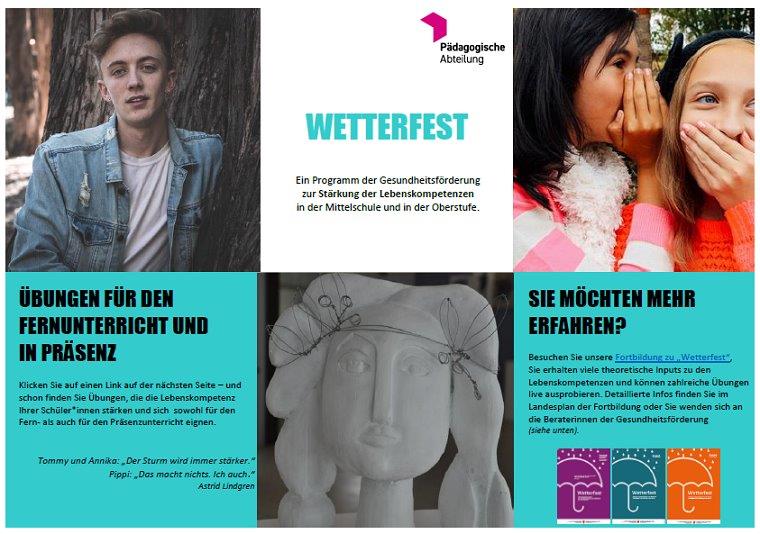 Die Deutsche und die Ladinische Bildungsdirektion unterstützen die „Aktion unVerzichtbar“ in der heurigen Fastenzeit mit digitalen Unterrichtseinheiten aus dem Programm „Wetterfest“, die eine persönliche Auseinandersetzung mit den Lebenskompetenzen anregen. Angesichts der Corona-Krise sind vor allem junge Menschen aufgefordert, sich für eine bessere Zukunft stark zu machen. Übungen für den Unterricht und darüber hinaus finden Sie auf dem digitalen Folder.
